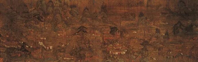 李思训绢画山水小幅,布置溪山、村落、人家,大与今画布置殊,殆是唐无疑。