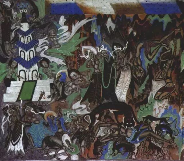 段成式或张彦远等所记,不仅可以见出壁画格式位置,且可明白内容。当时已多杂画,佛神天王之外,花木竹石,飞走游潜,无所不具。说法变相,且将画题扩大,庄严中浸透浪漫气息,作成一部具色彩的平面史实或传奇。