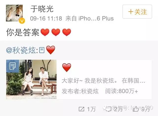 随后于晓光也在微博上深情的回应:“你是答案!”