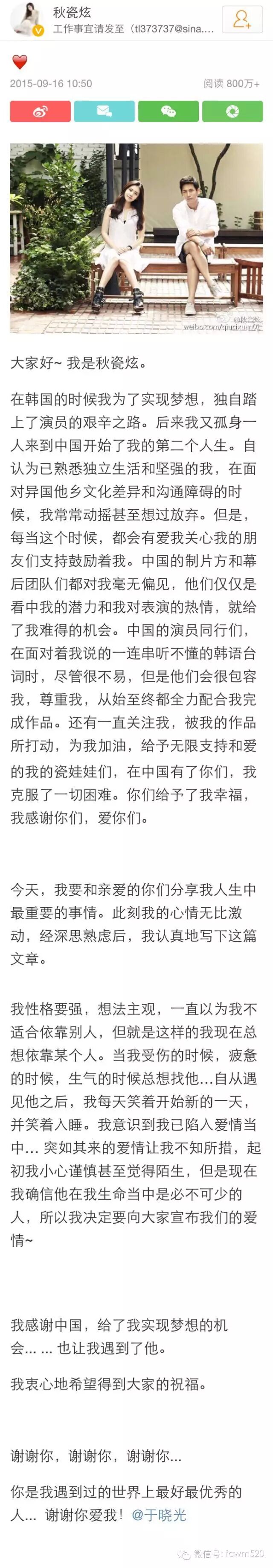 在9月16日晚上10点50分,秋瓷炫发表长微博,公开与中国男演员于晓光恋情。在微博上甜蜜写道,“你是我遇到世界上最优秀的人!谢谢你爱我!”