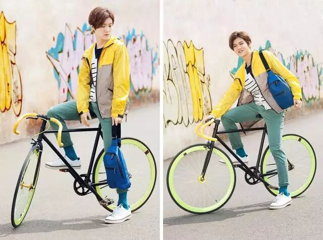 再来看这身,去年刚刚过完25岁生日的“国民小鲜肉”带着重返二十岁的新生力量惊喜来袭,以多样风格加入到Coach星尚人行列,展现新晋男神的迷人魅力:色彩明快的拼色防风夹克搭配简约百搭的白色牛津帆布运动鞋,绽放出青春朝气与趣味,蓝色单肩斜挎包与荧光绿活力单车将潮流运动风格淋漓展现!