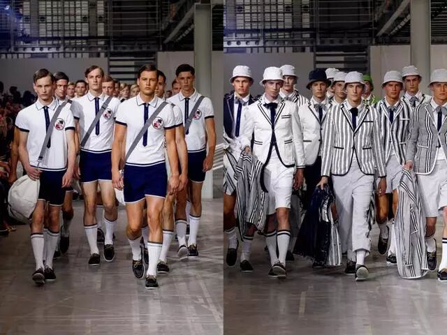 论精致,当然还有意大利运动服饰Moncler与著名设计师Thom Browne联合推出的高级时装品牌,骚年们穿着拉链式Polo衫、蓝色短裤背着斜跨大包,脚踩白色胶底帆船鞋配饰白色足球袜,齐刷刷三七分小平头浩浩荡荡集体开场,令人瞬间嗅到青春荷尔蒙,触到激昂脉搏,仿佛身临牛津Vs剑桥主场迎战皮艇比赛!