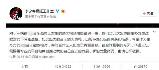 本该是[年度最佳内地歌手]却颁成了[年度最受欢迎内地歌手],据说是和李荣浩的奖杯弄混了.....