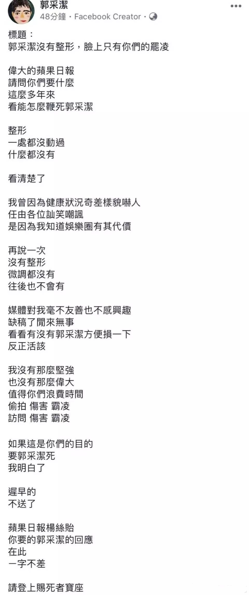 8月18日晚,郭采洁突然在网上写下244字长文,文中郭采洁写到:郭采洁没有整形,脸上只有你们的霸凌。我曾因为健康状况奇差样貌吓人,任由各位讪笑嘲讽,是因为我知道娱乐圈有其代价。并表示没有整形,微调也没有,以后更不会有。