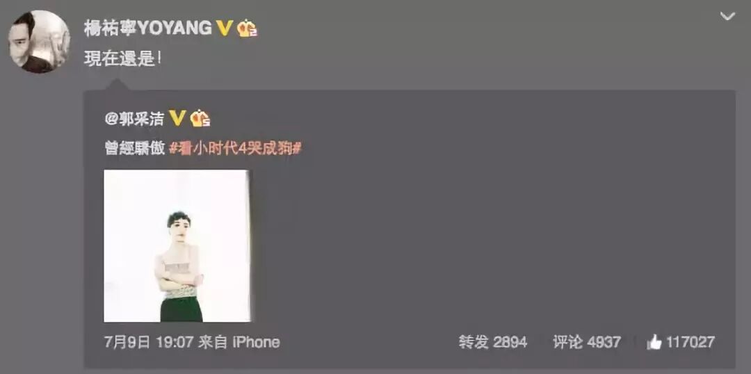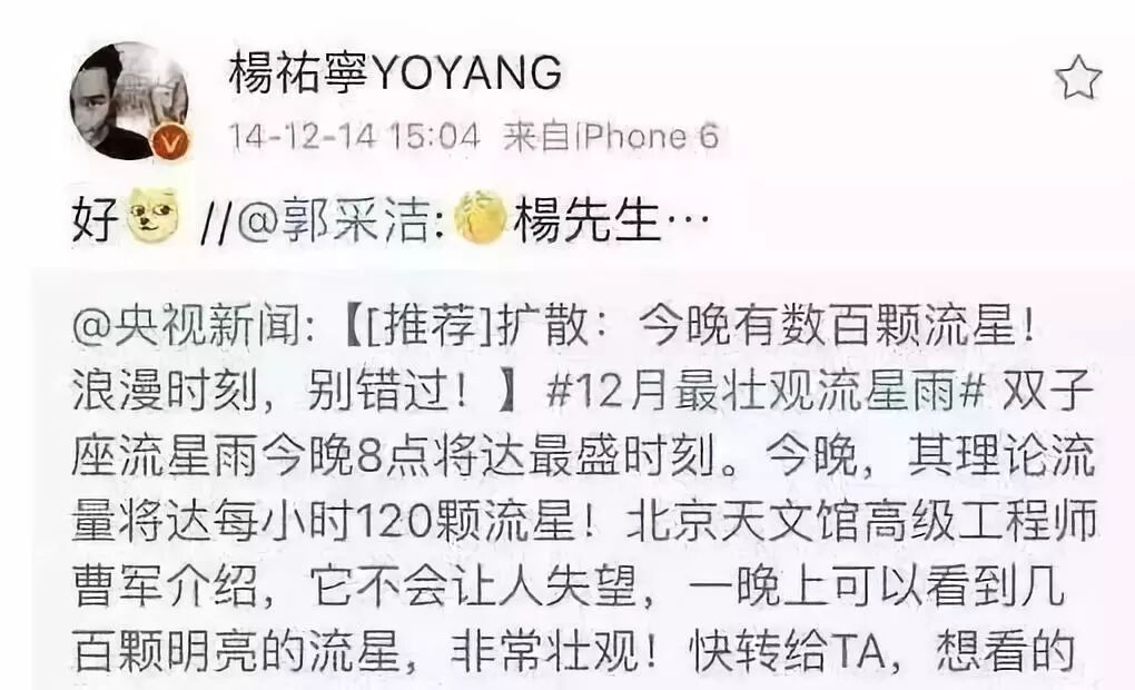 感受一下两人在微博上发的糖:新闻说会有流星雨,郭采洁就转发并说杨先生,杨祐宁也十分宠溺的回一句:好。