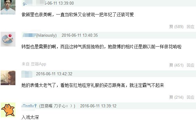还有网友认为郭采洁演了顾里之后,拍照等的风格都是冷艳女王范,曾经那个清新可爱的郭采洁没有了,演的角色也一直没能逃脱顾里。