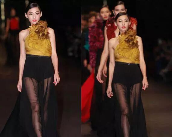 高贵黄衣黑纱走秀,虽然个头比专业模特矮半头,但气势绝对不输专业模特,霸气十足!