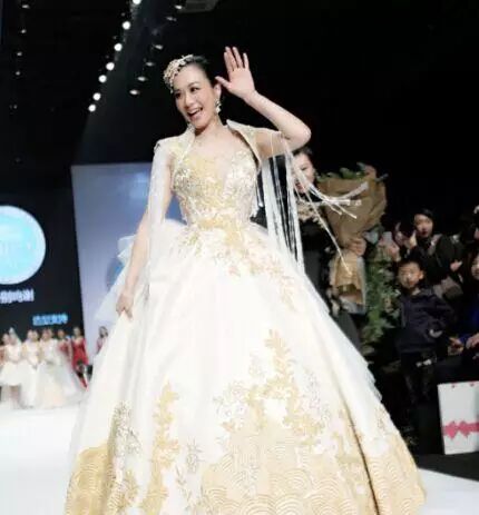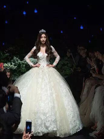 中国国际时装周2014春夏“深白 彭晶婚纱礼服”发布秀。钟丽缇身披设计师为其量身裁定的“极光”高定婚纱压轴走秀,光彩华贵,宛若女神降临,令全场惊叹。