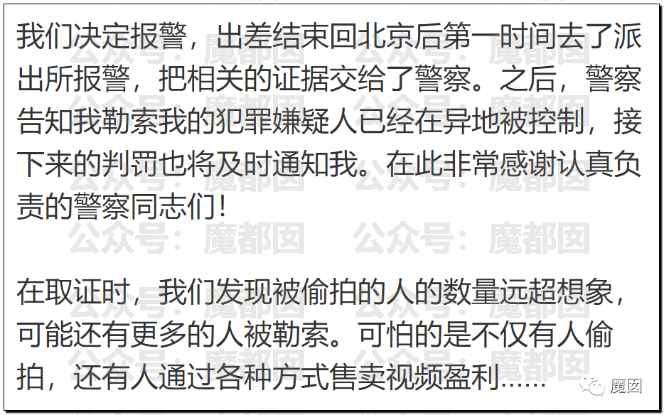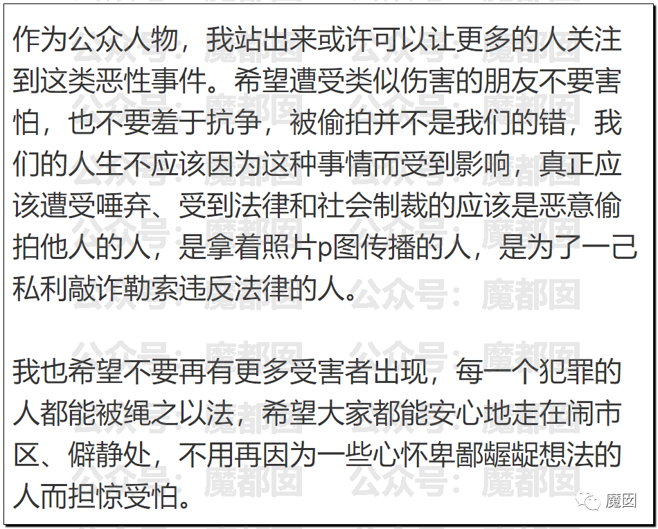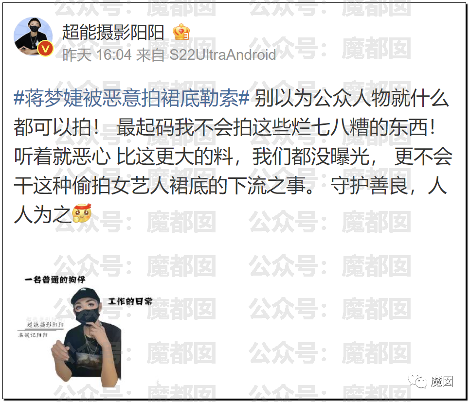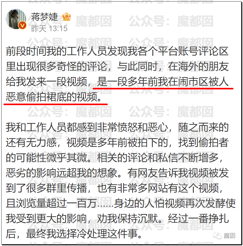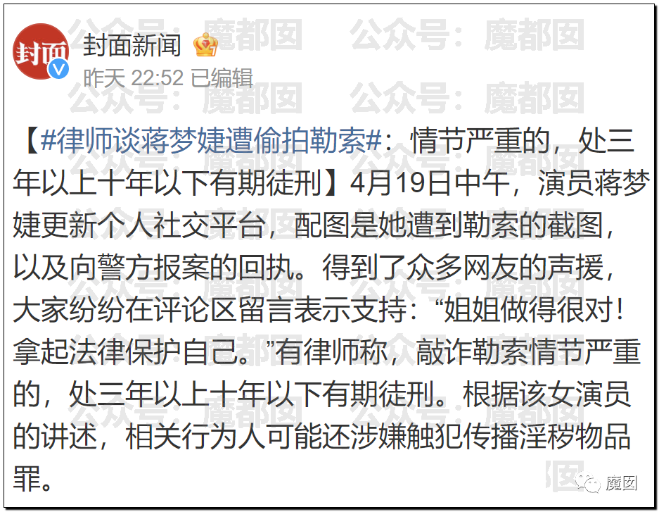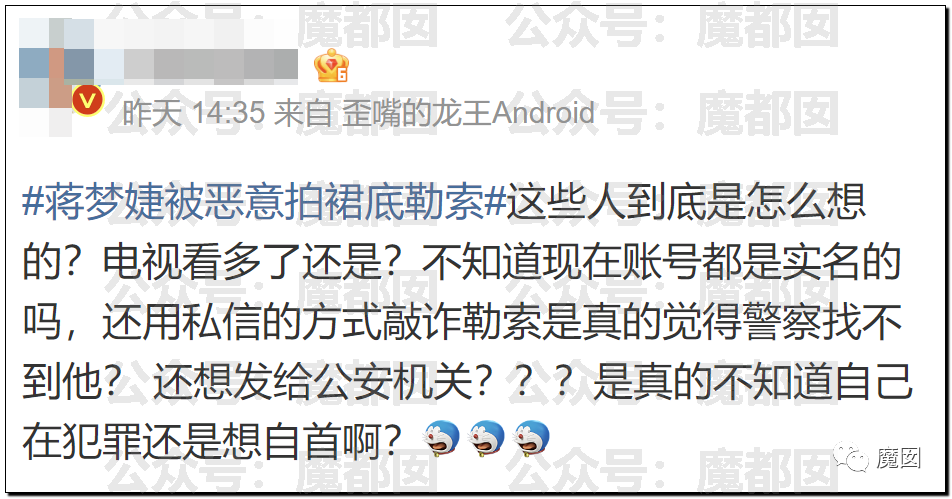 热搜第一!蒋梦婕被裙内抄底偷拍事件完整版+发文控诉勒索! 魔囡 内地女星 2023-04-20 01:03:31 589 创作不易,用心坚持,欢迎请BaGua喝几杯爱心咖啡!打赏并支持本文 打赏并删除本文 热搜大家都看到了,超过6亿的阅读量啊,不得了:蒋梦婕是谁不多介绍了吧?最近的一部片:日常:闲言少叙,入正题。我们看到这个事情的时候是什么感觉?错愕。真的是错愕,因为可能大家并不知道这个事情,我们是早在一年前就知道了,我们怕记错,还特地拜托资深网友帮我们找一下,起码明面上这个事情去年5月份就有了。当时网上传遍了。我们也不知道到底是哪个缺心眼的蠢人会做这种事情,于情于理都说不通,是否是觉得蒋梦婕不算是一线顶流就好欺负?今天她发文了。从她发文的内容来看,视频拍摄时间可能更早,可能是她刚刚初出茅庐,还不算最巅峰的时候被人偷拍的,那个时候她可能还是刚刚脱离了素人阶段,走在大街上还没有多少人认识的情况下去偷拍的。她被偷拍的这个视频不说人人都有吧,起码在外网的很多地方都已经属于漫天遍野了,所以我们更加错愕,怎么会有人在今时今日还在拿这个东西去勒索她?这是她被勒索后的情况:我们彻底无语……这个人是失智了吗?今天N多网友问我们就是想知道到底发生了什么事情,我们大致和大家说一下。具体我们不知道是什么时候拍的,从周围的人都没有戴口罩的情况看,极大概率是2019年左右拍的。大家记住这套衣服,我们找到了2019年6月她的一些照片,基本上可以大致推断可能就是在那个时候拍的,她应该去某个商场做个活动之类的。这套裙子是一模一样的:偷拍的这帮人应该是专门街拍偷拍的那批人,因为据说这个视频最早就是发布在各类偷拍、街拍等板块。是,可能大家到这里明白我们错愕的原因了,就是那个勒索她的人极有可能并不是真正的偷拍者。如果要勒索不会在那么多年之后再勒索。可能真正的偷拍者拍完卖掉视频给外网网站之后就闪人了,而在这个偷拍视频流传多年之后竟然会有人拿着这个东西去勒索蒋梦婕……我们是相当无语……是偶尔得到了完整版想去捞一票?不仅我们不理解,很多大V也不理解,这不是正常人心智能做出的事情:当时她在走路,从拍摄的角度来看应该是手持低拍设备:可以看到,偷拍者跟了她一路,蒋梦婕的颜值在无美颜的情况下其实相当能打,吊打90%以上的网红美女是绝对没有问题的。穿着也是非常得体,并无暴露的情况,因此,这次偷怕纯粹就是极其恶意的偷拍。她的皮肤真的非常好,整个人浑身白到发光,比周围路人白几个度,这可不是打光板打出来的效果。这个偷拍者一直跟着不放,似乎一直在企图拍点什么。一直在找机会,但是没有。所谓的裙底抄底偷拍其实是在电梯上完成的,当时此人就站在她身后,贴得非常近,可能她本人包括她身边的工作人员都没想到后面还有这么一个畜生在搞事。然后这个畜生的镜头是越来越往下:最终是拍到了裙底,她当时没有穿安全裤。事情其实就是这么个事情,当然,这种事情如果当时宣扬起来对于还在上升期的她来说是绝对的负面,所以我们觉得她当时选择冷处理其实是有一定道理的。但是这么一种本该是被全网唾弃的东西竟然得到了很多畜生的追捧,这是蒋梦婕贴出来的:有粉丝看到提醒她:然后这个就是勒索者:明码标价的勒索她:非常的恶臭!不仅是脑子有问题,还是法盲:勒索的证据:显然,事情到了这一步就已经不是冷处理能解决的了。最终,蒋梦婕选择报警:这是接报回执:我们真的觉得她非常了不起。在我们的印象中,能够勇敢站出来面对这种事情的女艺人她应该是第一个吧?这是她站出来的初衷:网友们都非常的支持:很多狗仔都在吐槽这个事情,因为这种偷拍显然已经大大突破了法律底线:根据蒋梦婕公布的对话截屏,勒索者显然了解明星们最怕的是什么,诸如声誉、广告违约、狗仔等。不管是作为女性,还是作为艺人,面对这种卑鄙无耻的做法,没有怯懦而是敢于说“不”,敢于报警,敢于向丑恶作斗争,每一个有良知的人必须要给蒋梦婕点赞。著名演员海清也为她点赞:即便明星属于商业文化包装下的特殊群体,但他们也是活生生的人,有尊严的人。演艺行业是一个不得不与“舆论”打交道的行业,所以演艺圈里的大部分人都是“胆小怕事”的,不敢强出头,生怕被一群狗仔或者闲杂人抓住把柄,小题大做,毁了前程。事实上,很多偷拍者就是抓住了明星的这个弱点去从事一些不可告人的营生。律师谈这个事情,对方大概率会被判刑:但是邪不压正,只要行得正,做得端,任何人就完全没有必要去害怕这些勒索者。我们知道类似的事情相当多,我们接到的爆料很多都是男女朋友分手后男方把女方的私密照和私密视频发出去来报复、威胁和勒索的情况,我们想说,这是绝对违法的行为!任何一个社会、任何一个时代,都不允许向丑恶势力低头,都不能够容忍假丑恶的盛行,那些践踏他人尊严者,那些侮辱女性者,那些伤害无辜者,都必将受到法律和道德的惩罚。 创作不易,用心坚持,欢迎请BaGua喝几杯爱心咖啡!打赏并支持本文 打赏并删除本文 感谢您的支持鼓励,我会继续努力的!文章地址:用户邮箱:打赏金额:USDT 请输入数字点击”去打赏“,即可进行打赏支持本文章哦 蒋梦婕 发表评论