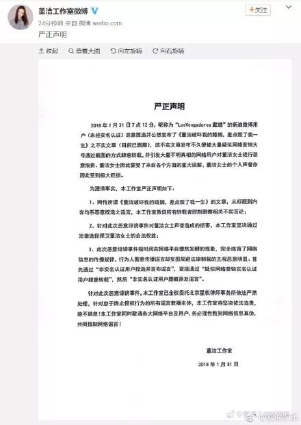 董洁工作室在四个小时后发布严正声明,称该文章从标题到内容都是恶意捏造的谣言。