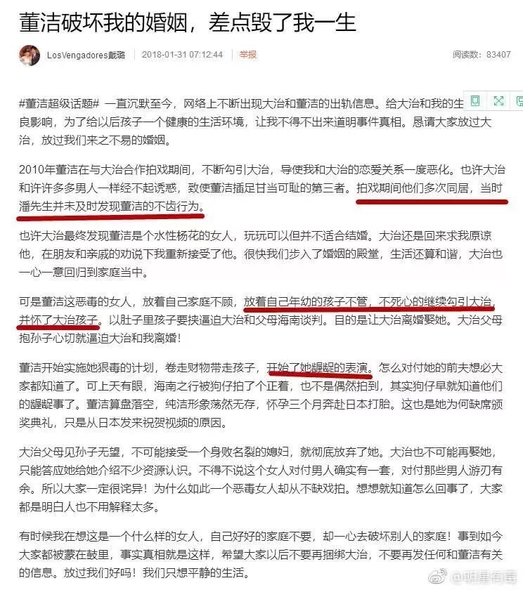 文中控诉了董洁的种种恶行,破坏自己与王大治的婚姻,差点毁了自己一辈子。