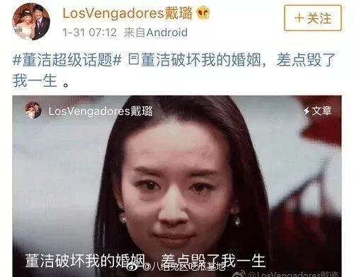 前几天,疑似王大治的妻子戴璐在微博发布文章,称董洁破坏她的婚姻,差点毁了她的一生。