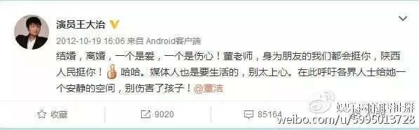 经过八组的详扒,居然发现这个微博并不是王大治妻子戴璐使用的,而是董洁的粉丝在自导自演。