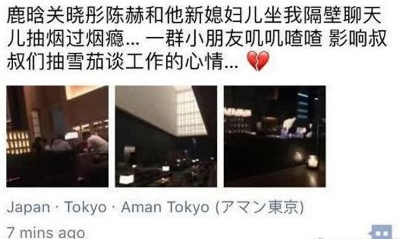 鹿晗最近和关晓彤去日本,其实共游的还有陈赫夫妇,还有网友爆料他们聊天声音太大还被其他客人抱怨,鹿晗现在和陈赫走得很近,两人算是各取所需,陈赫能借鹿晗的人气,鹿晗也能靠陈赫扩大自己的人脉。
