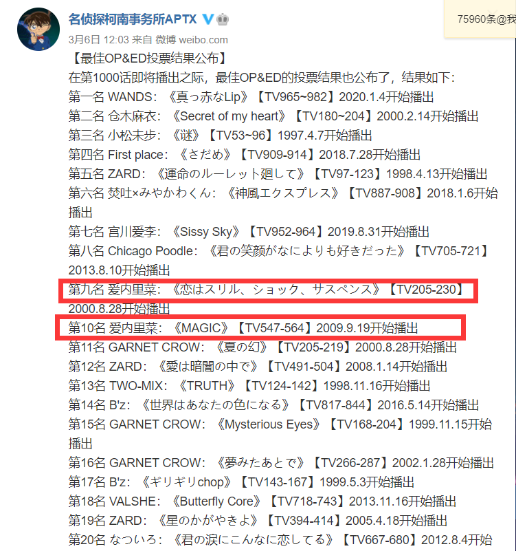 前几天公布的,由42万人选出的“最爱的柯南歌曲”评选的前十首中,就有两首是爱内里菜唱的。