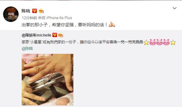 随后,陈晓转发陈妍希的微博:“出拳的那小子,希望你坚强,要听妈妈的话!”