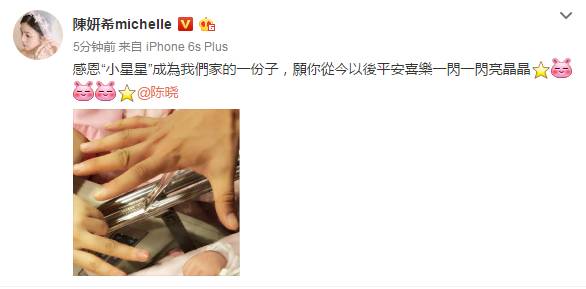 12月20日,陈妍希在微博晒出“一家三口”合照,并写下:“感恩‘小星星’成为我们家的一份子,愿你从今以后平安喜乐,一闪一闪亮晶晶[兔子][兔子][兔子]@陈晓”