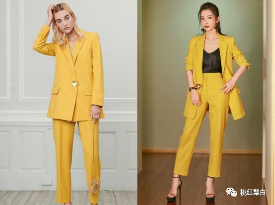 李冰冰的正装造型这两年来一直keep的很好,相比女性化的长裙look,这种剪裁利落的西服套装感觉更适合她的气质,尤其是这个明亮的黄色,配上内搭的黑色V型皮质吊带,整体看起来非常有格调。