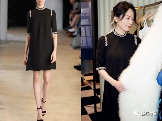 首先是在Prada试衣的这一身,还是她一贯偏好的简洁one piece连身裙,all black的配色,加上领口和袖口处亮眼的钉珠配饰,让本来略显沉闷的小黑裙,现在怎么看怎么精致。
