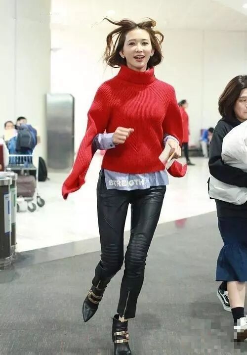 红色高领毛衣衣袖的设计独特有范,内搭一件浅色衬衣,下搭一条黑色皮裤,脚踩一双高跟鞋,整体简单又不失时尚感。