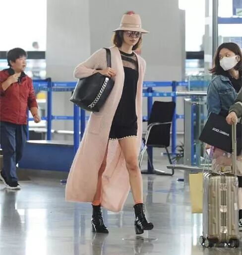 现身机场头戴帽子,身穿黑色裙子搭配浅色开衫外套,脚踩一双黑色高跟鞋,这样看起也是气场十足。