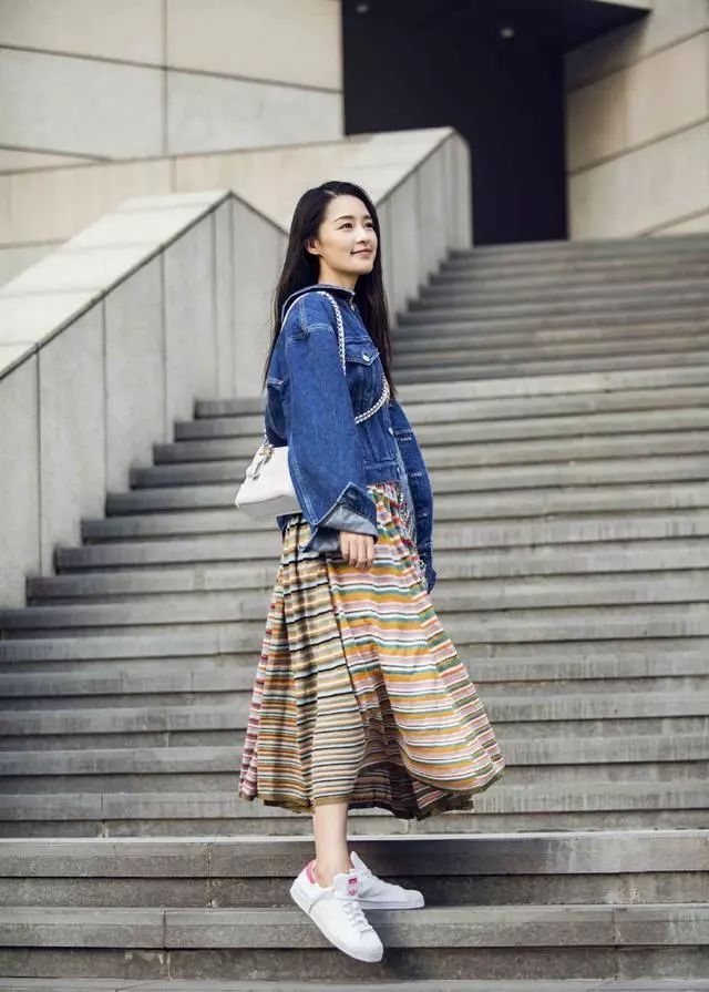 李沁上身穿了件蓝色牛仔外套,下身搭配条纹长裙,将外套的衣扣打开,显示出十足的休闲范儿,清新的色彩组合,呈现出天真烂漫的少女风情,李沁显得也是非常轻松自在,长长的秀发自由垂下,很是顺滑流畅,面带笑容的李沁更是充满了少女元气。李沁穿着的这件衣裙为条纹拼接式,自带色彩层次感,宽松而随性,多种纹理交织,带来丝丝复古风,脚踩小白鞋,为年轻人喜欢演绎的款式,充满了减龄感,斜挎了个链条小包包,更是凹出时尚摩登气质。
