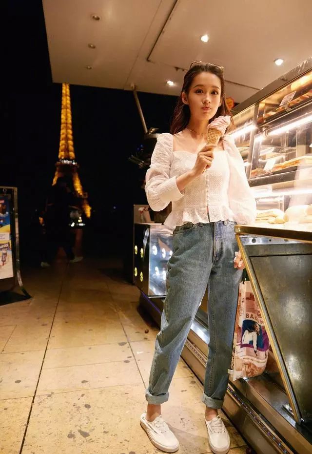 从这张照片看,李沁还是蛮可爱的,吃了一口冰激凌,是不是感觉到不好意思了呢?这么高热量的食物,难道李沁不担心长胖吗?李沁上身穿了件方领上衣,显露出其精致的锁骨线条,被一条晶亮的choker颈圈装饰,显示出十足的高贵气质感,带有泡泡袖的衣身裁剪,呈现出蓬松感,带来丝丝清新复古的公主范儿,短短的上衣下摆,拼接有荷叶边装饰,尽显甜美少女风情,并且还提升了腰线,显示出高挑身材、李沁下身穿了件牛仔裤,为上宽下窄的哈伦裤版型,将其苗条笔直的双腿线条展示得淋漓尽致,李沁还将裤脚卷了几个边,脚踩半拖白色休闲鞋,很是显青春活力。