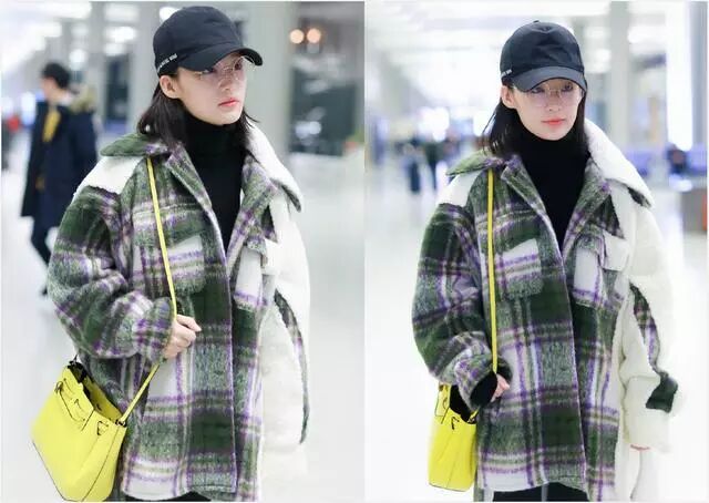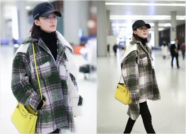 李沁外面穿了一件长长的格纹外套,为拼接式的造型,显得格外地温暖舒适,多种线条交织而成的纵横纹理,呈现出英伦式的复古风,带来惬意休闲穿着体验,胸前的大大口袋装饰,丰富了层次感,带来丝丝工装意味。大衣为前短后长款式,新颖别致,体现出层次感,oversize的大廓形裹挟在李沁身上,竟然看不出臃肿感,呈现出满满的自由自在的逍遥范儿。李沁戴了幅金丝边眼镜,显示出丝丝文艺气息,头戴黑色棒球帽,凹出时尚感,单肩挎黄色小方包,提升了整体搭配的明亮色彩感,洋溢满满青春活力感。