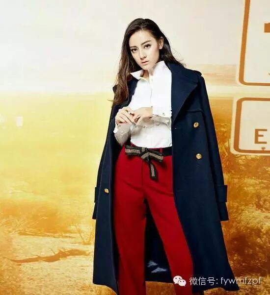 海军色大衣内搭白衬衫、红色阔腿裤,非常知性干练,蝴蝶结作为腰带,可爱又时尚。