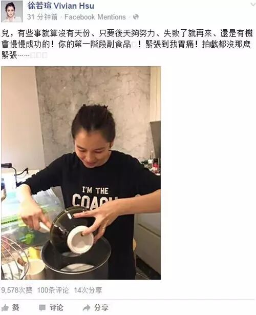 羊年8月13日,徐若瑄历经千辛万苦终于顺利生下儿子小V宝,虽然孕期卧床142天,挨了300针安胎保,幸而母子平安。现在,帅萌的小V宝已经6个月啦,可以添加辅食了。前两天,女神在脸书上晒出素颜素颜做辅食照片,表示自己做辅食比拍戏还紧张都胃痛了。