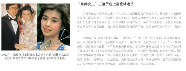 “大众情人”王祖贤混乱不堪的情史 大碗凉皮 港台女星 2021-08-12 17:16:49 898 创作不易,用心坚持,欢迎请BaGua喝几杯爱心咖啡!打赏并支持本文 打赏并删除本文 点击上方△蓝字→右上角菜单栏→设星标★“无所谓啦,就当我儿子花几千万叫了个鸡好了!”当媒体询问林建岳的母亲时,这位老太太的回答让人目瞪口呆,意思就是骂王祖贤是婊子!那时,已经为林建岳生下了两男三女的谢玲玲,在林家的地位已十分稳固,林父林母与儿媳谢玲玲关系非常好。因此,面对儿子婚姻的第三者王祖贤的出现,老太太说出这样的话,也不为怪。 01王祖贤1967年1月31日王生于台北一个体育世家,家中还有两个哥哥,她是老幺。和所有的家庭一样,两个哥哥从小便宠着她,漂亮的妹妹是全家人的最爱宝贝。她上的第一所中学崇光女中,管得特别严,经常都要考试,她从小喜欢打篮球,常常会逃课去打球,12岁时已是台湾一家公司的女子篮球队的职业前锋。她父亲也看出她不是读书的料,让她转到怀生国中加入篮球校队,专心的练篮球。没想到一次偶然的机会,改变了她的命运。1982年的一天,15岁的王祖贤正在篮球场打篮球时,高挑的个子,腾空跳跃的身姿,被一名路过的广告商一眼相中,邀请她拍一则阿迪运动服广告。广告一经播出后,她的人生路上就划掉了篮球运动员这个选项,只剩下“演员”这条路了。同一年,“双林”中的林凤娇怀孕和成龙结婚后退出影坛,于是,林青霞的梦想就是成为第二个将林青霞。随后,她考入了国光剧艺实验学校,开始一年多的专业演艺学习,算是入门了。那时候的王祖贤,因为拍的运动服广告广为传播,已经小有名气,第一次踏入艺术学校时很多学长都站在门口等她,想要一睹芳泽。一年后,通过摄影师宋立平的介绍,王祖贤认识了导演叶金淦并获得了《今年的湖畔会很冷》的试镜机会。已经小有名气的她,从30多个试镜中脱颖而出。出道的处女作就是女主角“女鬼江若萍”,相比于多年跑龙套的演员来说,不得不说,有的人就是被命运偏爱。在这部剧拍摄时,报纸上传出她与男主角黄永洪的绯闻,当时闹得整个台娱传的热热闹闹,还没播出就被广泛关注。不过,电影一经播出后,绯闻便没有了下文,黄永洪也没有了消息,烟消云散。不过,这部剧却获得了台湾电影金马奖,为王祖贤搭桥牵线的宋立平也获得了金马奖中的最佳摄影奖。虽然,女主演王祖贤并没有获奖,不过,因为这部戏也迎来了生命中的贵人。 02在《今年的湖畔会很冷》的金马奖颁奖典礼上,邵氏影业出品的电影《男与女》也获得台湾提名金马三奖,作为台湾分公司经理的马芳踪在席颁奖典礼时,她一眼就相中了才出道年轻又青涩的王祖贤。 马芳踪返回香港后,立即推荐给邵氏的的老板,邵氏影业当时的老板方逸华慧眼识金,快速以28万港元的高价格买下了王祖贤的签约。到了香港,邵氏影业对王祖贤的照顾可以说尽心尽力。王祖贤刚来香港时,生人地不熟,老板方逸华对她非常上心,不但配专用宿舍,还请人专门教她粤语、英语,获得了邵氏的鼎力支持。在熟悉香港后,邵氏影业老板方逸华拿出四部剧本,让她自由挑选角色。王祖贤最终确定和尔冬升一同搭戏《天官赐福》。毫无经验的王祖贤,通过邵氏的安排,经常和周润发、许冠杰、钟镇涛、梁朝伟、黎明、尔冬升合作,“哥哥”张国荣也和她在戏棚下面奋战过一段时间。而在满满的娱乐圈帅哥,事业小有成就的王祖贤很快传出来绯闻。1985年,王祖贤与许冠杰合作《打工皇帝》时两人相识。当时的许冠杰已经结婚,还有了两个儿子,但他依旧对王祖贤各种送花送礼物,为博佳人一笑不惜豪掷千金,送了一辆价值不菲的金色保时捷。这段绯闻在当时已然成为各种小报茶余饭后的热门话题,毕竟这也是王祖贤的第一次三角恋。不过,王祖贤始终没有承认过这段绯闻,只说:“他们对我就像妹妹一样,很照顾,没有那些关系。”这段津津乐道的三角关系,就此沉没。 031987年,当时黎明初入娱乐圈,还是无名小卒,志在歌坛的黎明拜香港“音乐大师“戴思聪为师。而王祖贤的妈妈是戴家的常客,一来二去,王妈妈与黎明碰面的机会日渐增加,对黎明很有好感,后来王妈妈干脆收了黎明为干儿子。此后,王妈妈在人前人后对干儿子赞不绝口,在心中把他当作了女婿的最佳人选,创造机会让王祖贤与黎明接触。再加二人共同的好友林俊贤在中间的撮合,王祖贤与黎明越走越近。那时间,时常可以看到王祖贤到黎明驻唱的尖沙咀“火凤凰”餐厅酒吧捧场。后来因黎明签约了宝丽金,不在酒吧唱歌,王祖贤片约也越来越多,名气大增,二人见面少了,感情逐渐变淡。 04 王祖贤和许冠杰之间的绯闻还未平息时,她与尔冬升在娱乐场所暧昧不清被小报记者拍到。王祖贤对此回应:“我对他确实有好感,只不过是当成好朋友交往,不可能走在一起。”尔冬升有可能听懂了这句话,转而开始追求张曼玉。 就在这时,王祖贤遇到了第一位认可的男人:“痞子”齐秦。 05齐秦这个人成长经历很独特。他父亲是公务员每天忙于工作,母亲也整天打牌,丝毫没时间照顾他。作为独子的他非常叛逆,在16岁那年因为打架斗殴被关进了少管所。也正是这种成长环境,始终让他给人一种桀骜不驯,玩世不恭的感觉。1986年,在香港发展的王祖贤,受邀回老家拍摄一部爱情剧《芳草碧连天》。那天,王祖贤刚下飞机,男主角齐秦来迎机,一下