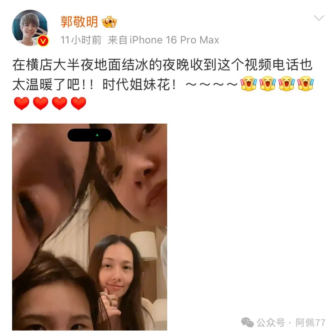 2024年12月16日凌晨,杨幂、郭采洁、郭碧婷、谢依霖四位女星同框与郭敬明进行了视频通话,郭敬明还在0时54分发布微博,晒出了与“时代姐妹花”的同框合照,引发众多网友关注和热议。