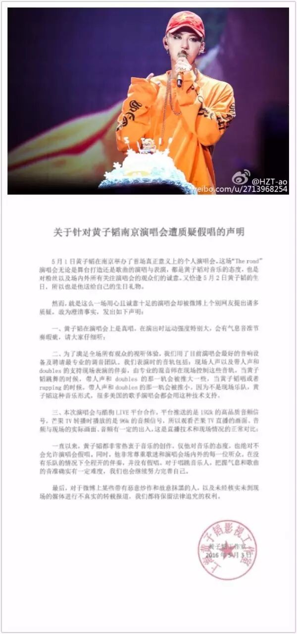 5月3日,黄子韬工作室发表题目为“音乐,我们是认真的!”的微博,否决了假唱传闻。