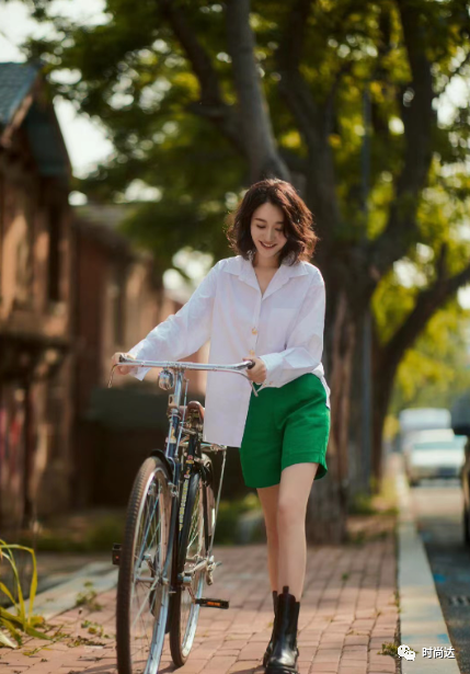 穿搭小技巧:白色衬衫+绿色短裤