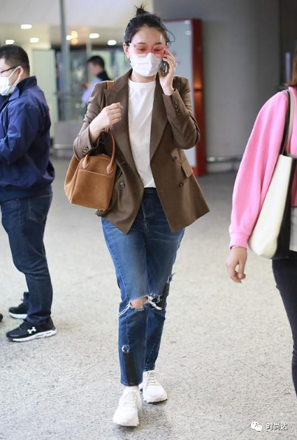 穿搭小技巧:白色打底+深咖色西装外套+破洞牛仔裤
