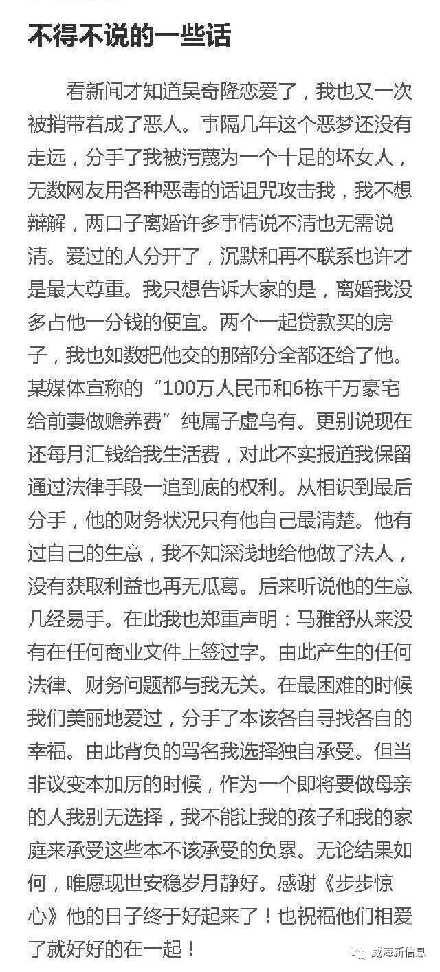 不过对此,和新任老公已经生下女儿的马雅舒则立即再度发声,称:“离婚后没占他一分钱的便宜,两人一起贷款买的房子。”而且还表示已经将吴奇隆付的钱归还了回去。
