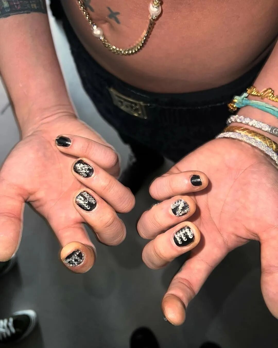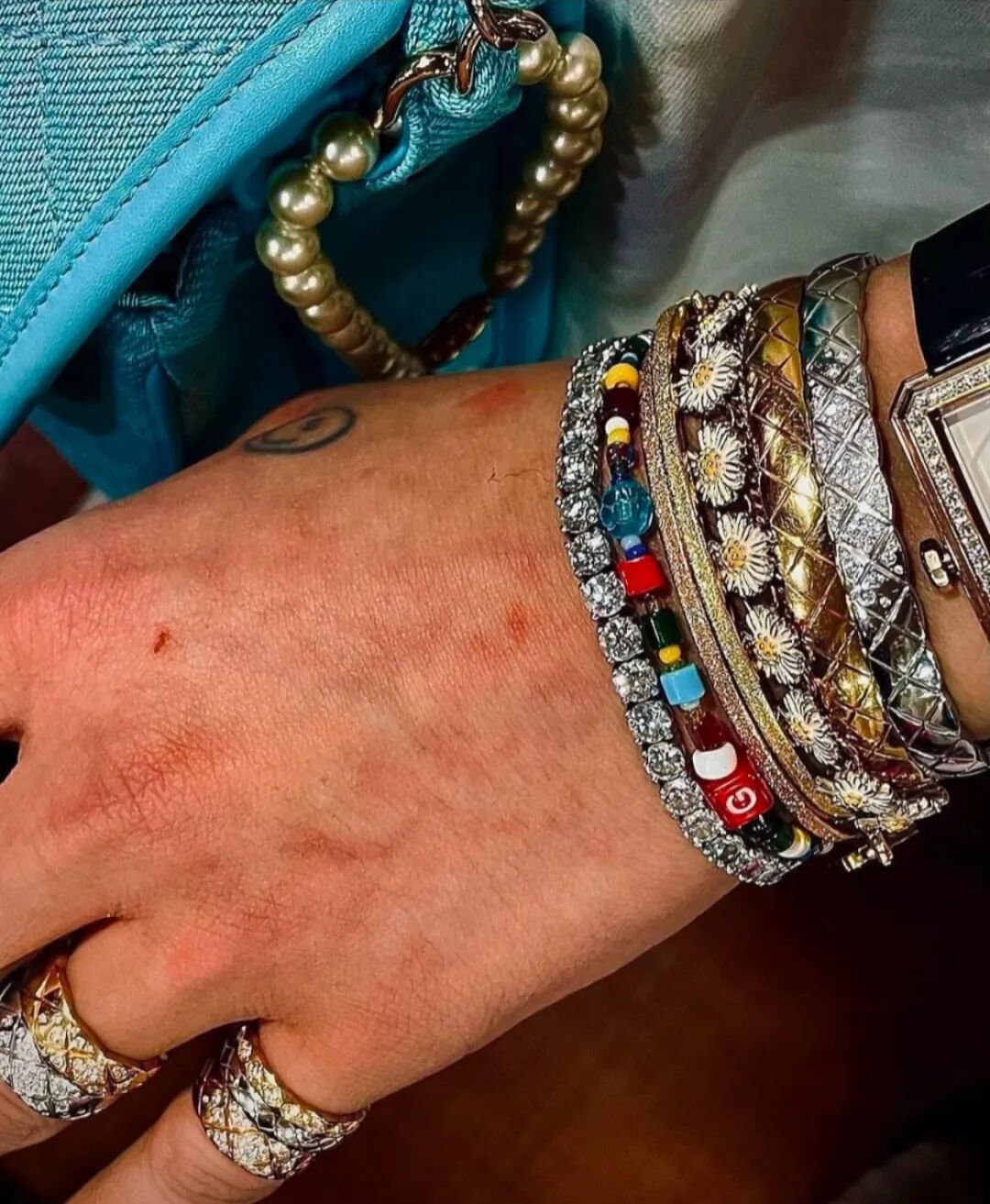 GD尤其擅长利用叠戴展现手腕造型的细节层次。他常将Iconica Fancy Gems手镯与Iconica Full Pave手镯同时佩戴,强化材质与光泽对比,构成灵动的视觉排列。