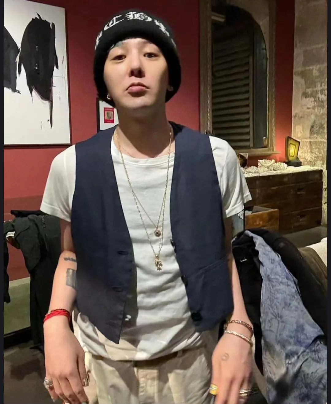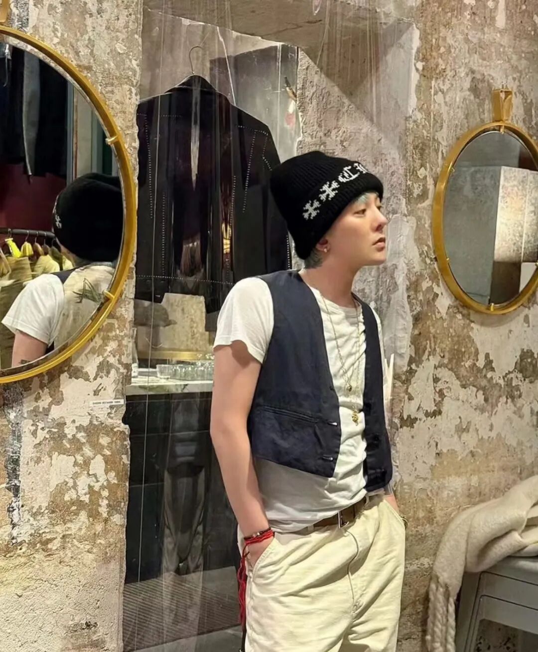 GD常常佩戴Chrome Hearts的十字架项链,粗犷的链条搭配精致的十字架造型,既展现出一种硬朗的摇滚气质,又不失时尚感。在一些舞台表演和公开活动中,这条项链成为他造型中的亮点,与他的音乐风格相得益彰。