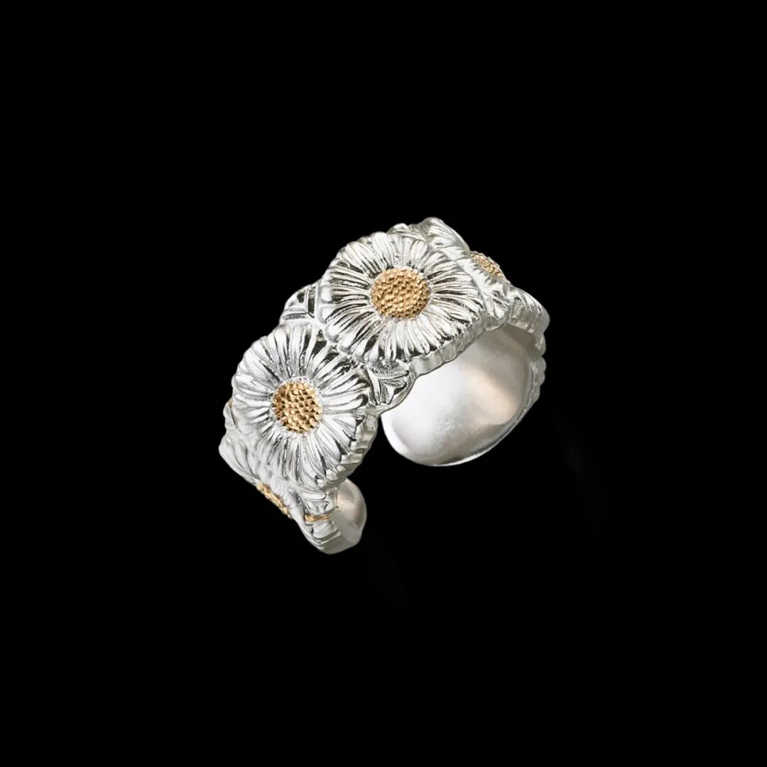 GD在2019年退伍后首次佩戴的Buccellati Blossoms系列Vermeil Eternelle雏菊银戒,以雏菊图案象征和平与希望,迅速引发了时尚达人们的抢购热潮。