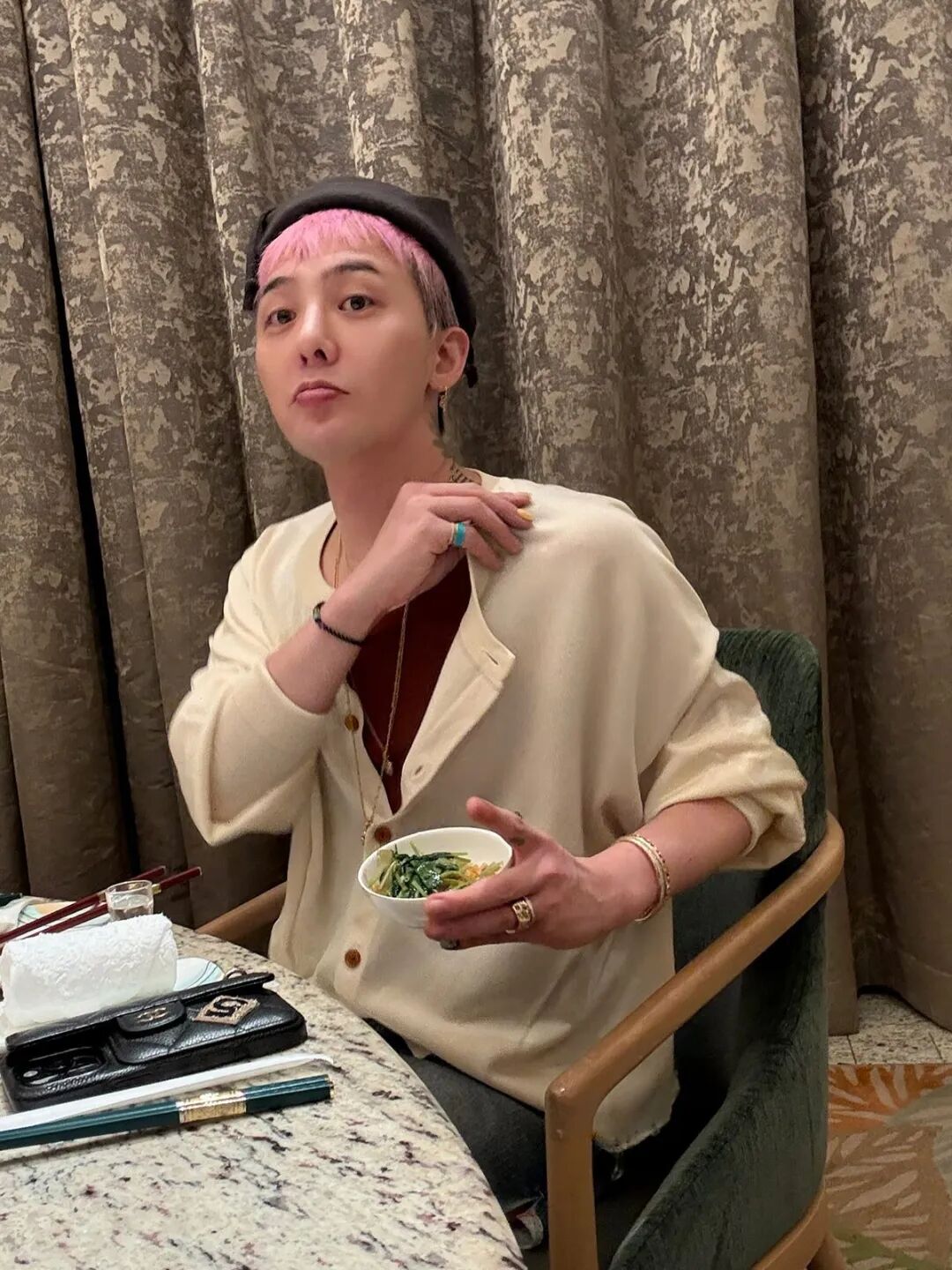 CHANEL的耳环、手镯也是GD造型中的点睛之笔。GD喜欢他一贯的叠戴,不仅为整体造型增添了一份优雅气质,还展现出他对于时尚细节的把控能力。