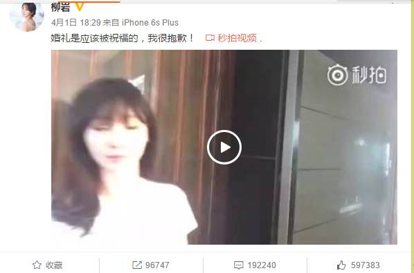 没错,道歉的不是新郎包贝尔也不是伴郎团,而是柳岩。整个道歉视频中,柳岩一直带着哭腔,几次强调,对大家造成的困扰她很抱歉。