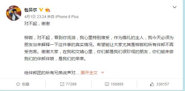 柳岩,对不起,看到你流泪,我心里特别难受,作为婚礼的主人,我今天必须为朋友出来解释一下这件事的真实情况。希望能让大家尤其是柳岩和所有伴郎不再受伤害。谢谢大家,在我和文婧心里,你们都是我们很珍视的朋友,你们能来做我们的伴郎伴娘,是我们的荣幸。
