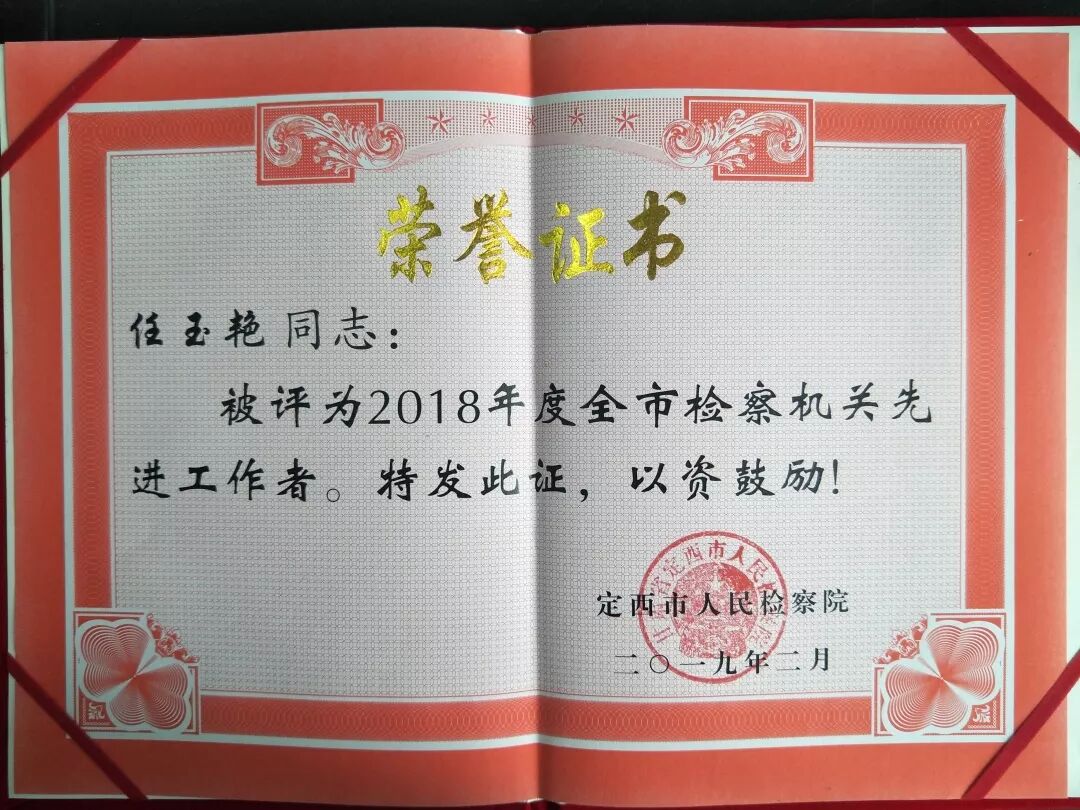 2月26日,在全市检察长工作会议上,临洮县检察院民行科被评为全市检察机关先进集体,办公室副主任冯婧荣获个人三等功,公诉科科长任玉艳、办公室主任雒卿龙被评为全市检察机关先进工作者。