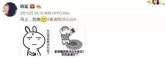 再说剧情的宣传策略,三生里有一段女主角被封印失去法力变成凡人被各种欺凌,吃瓜群众盼望女主早日跳诛仙台变成原来的上神,于是浅浅“跳诛仙台”这个剧情成为了万众期待的一幕,杨幂在微博上po出的图也是相当应景。