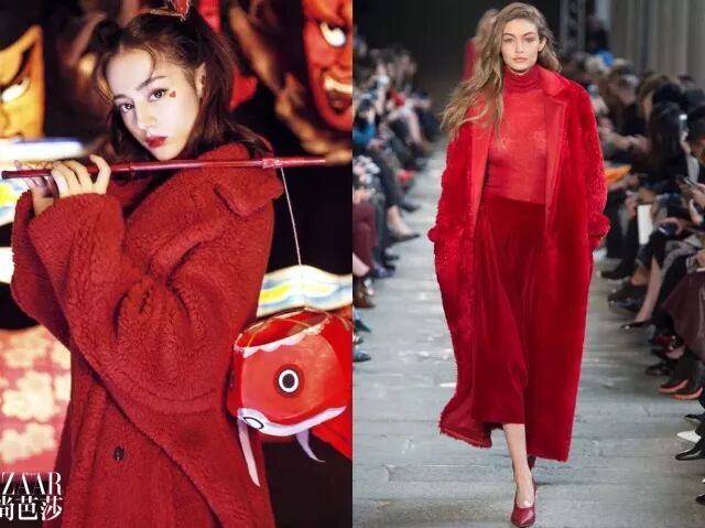 之后马思纯也在拍摄杂志封面时,演绎了秀场上一身红的同色系look。
