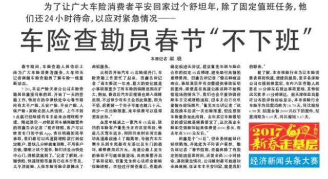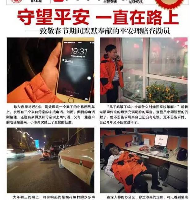 这种过春节的方式也让节日更加的温暖,其实我们生活中在春节里给我们带来温暖的普通人还有很多。他们为了让大家过春节过得更加舒心,都一直坚守在自己的岗位上,除了我们熟悉的警察和医生等等,还有一群也许你在节日匆忙回家的途中没有在意过的“隐形人”——平安查勘员,为你在春节回家团聚途中的护航逆行者。