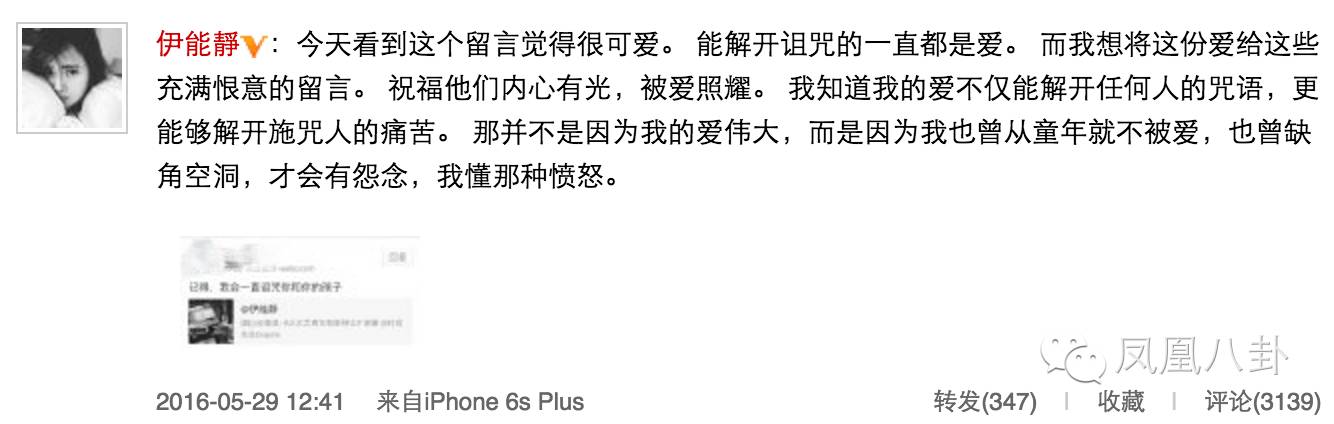 不过,如此的正能量却屡屡遭受网友们的非议,昨日有网友在微博上诅咒她和她的孩子…伊能静竟然截图回应了,对此她说觉得很可爱,并祝福他们内心有光,被爱照耀。母爱好伟大~