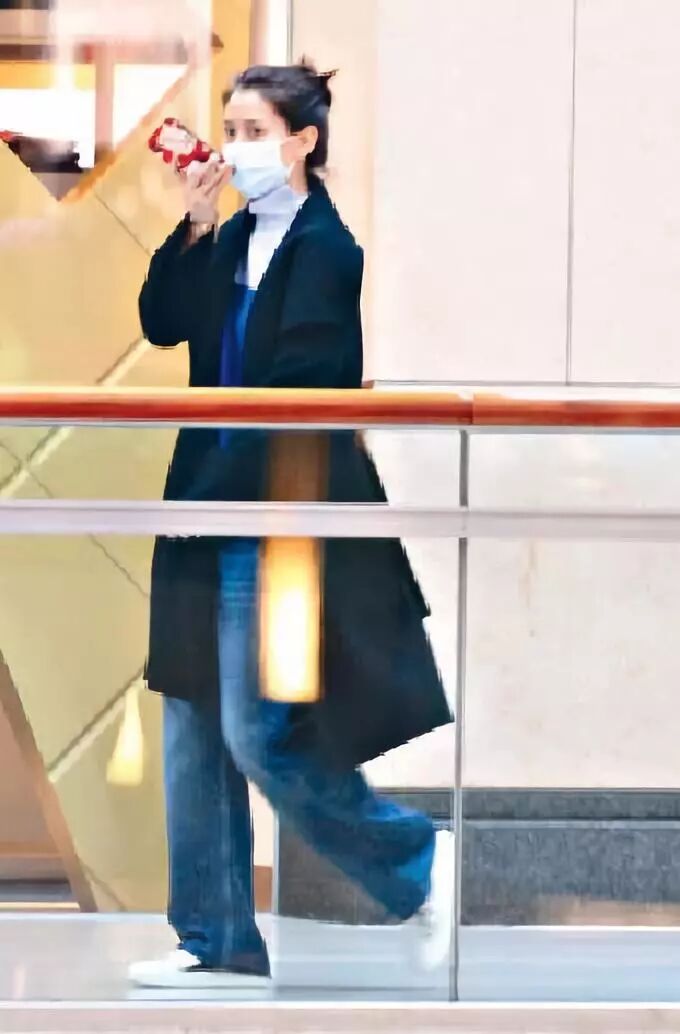 过了一会儿,妻子袁咏仪出现,当天靓靓穿着黑色外套、牛仔阔腿裤,戴着口罩,头发都绑起来卷成丸子头,显得特别年轻。
