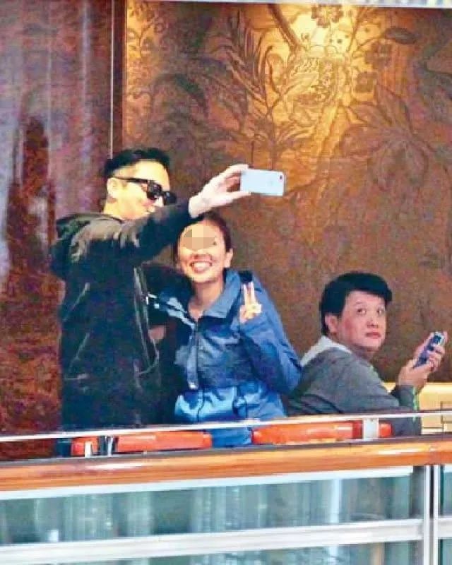 遇到路人要求合影也大方接受,主动拿手机与粉丝微笑自拍,戴上墨镜之后星味十足。