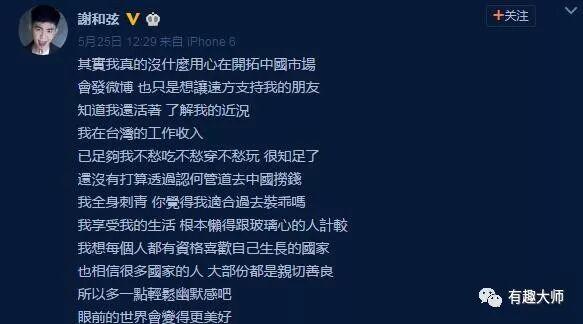 然而,网友们的留言,似乎并没有让谢和弦认识到自己的错误,在其后的数天内,他又连续发了数条微博隔空“喊话”大陆网友。